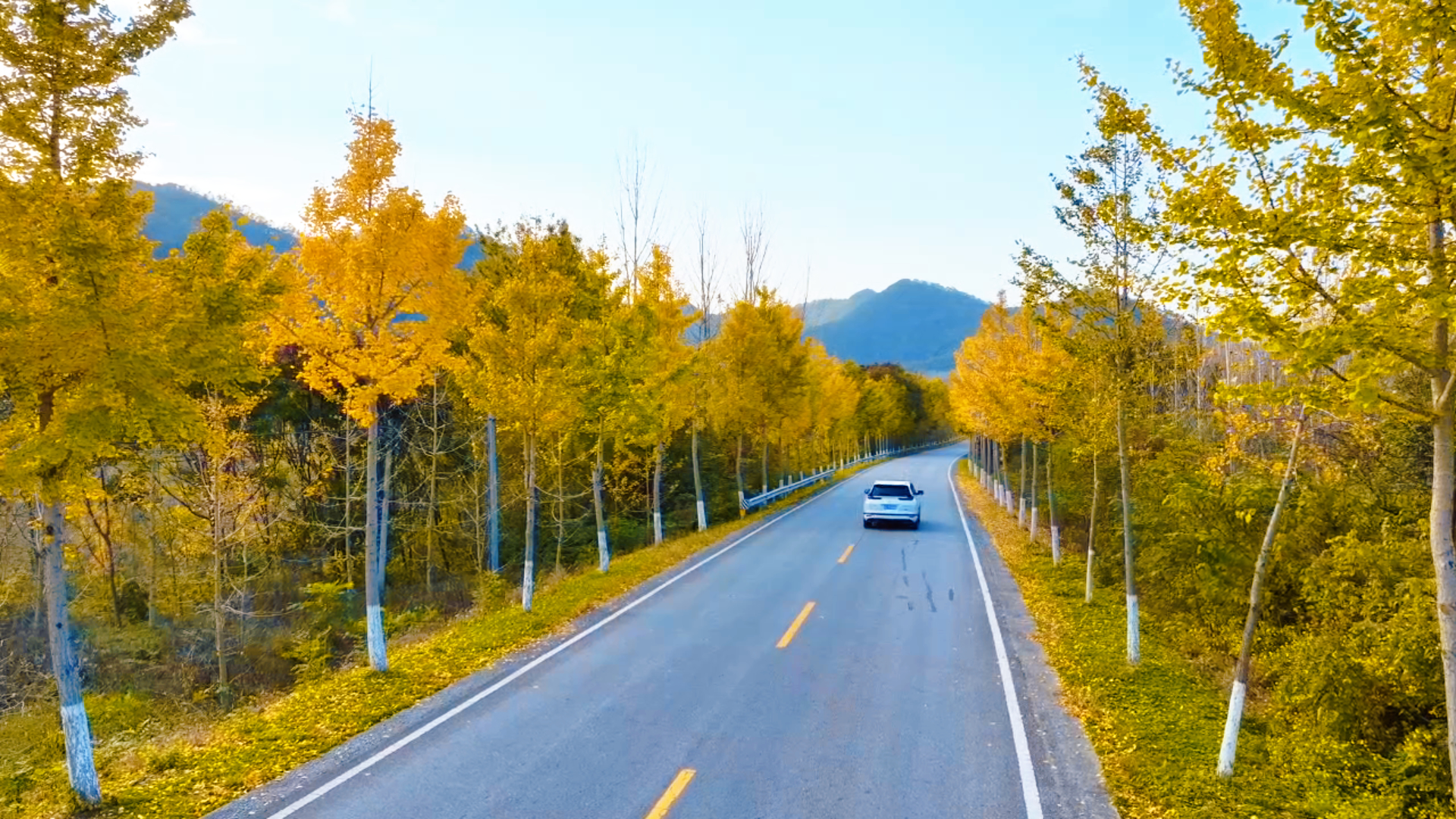 阳光穿透枝桠,在柏油路上织出细碎光斑,车辆驶过带起叶声沙沙,远处山峦笼着淡蓝雾霭,衬得满树金黄更暖。树干裹着浅白漆痕,与满地落金相映,连风里都浸着草木的清润。
