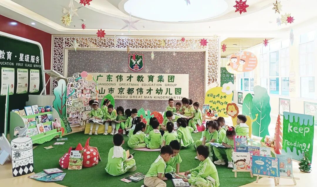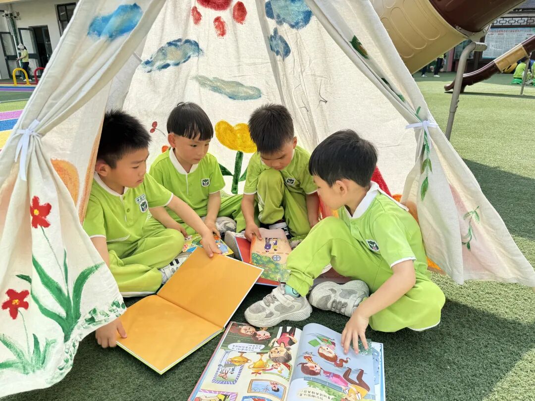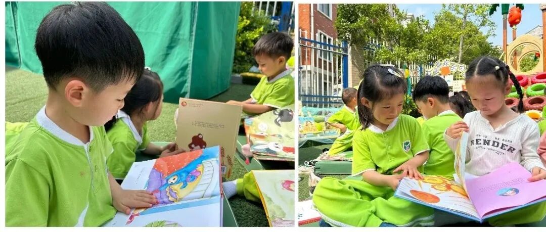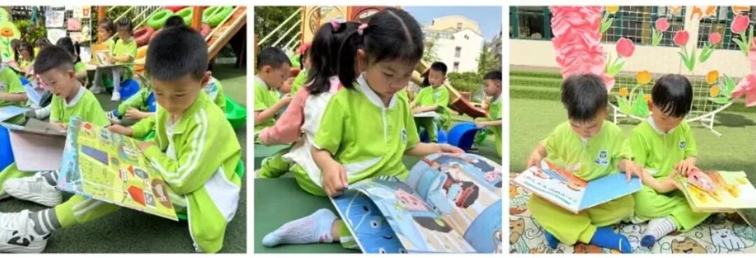 一人一书,三三两两,孩子们结伴坐在草坪上,一起分享自己最喜爱的绘本。有书相伴,与你为友,共同分享,友好合作,孩子们感受到了不一样的快乐阅读。