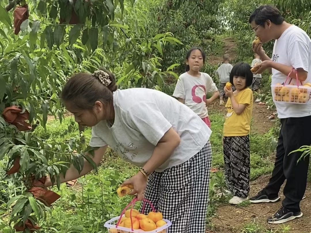 “3月份桃花盛开,今年五月末最早的油蟠桃已成熟,油蟠桃果肉细腻、口感香甜。现在每天都有城区市民、游客来此采摘,尽享田园时光。此外,我们还有杏子、李子、南方樱桃、桑葚及车厘子等多个品种水果。”百合庄园负责人说道。