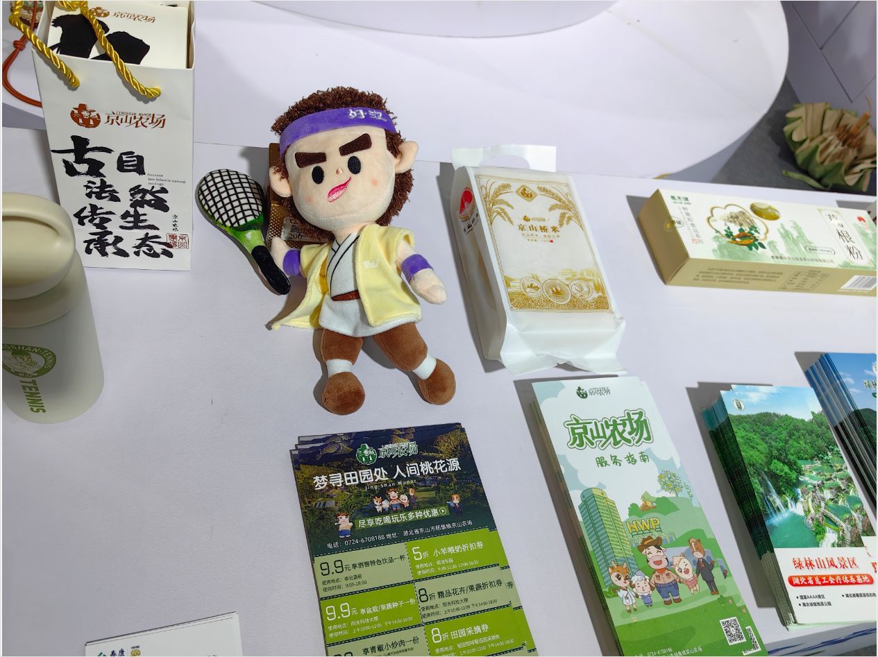 现场展销区域,摆放有京山桥米、葛根粉、绿林小子玩偶等特色农副产品和文创产品供游客体验和购买,并设置互动环节,生动传递特色文化。