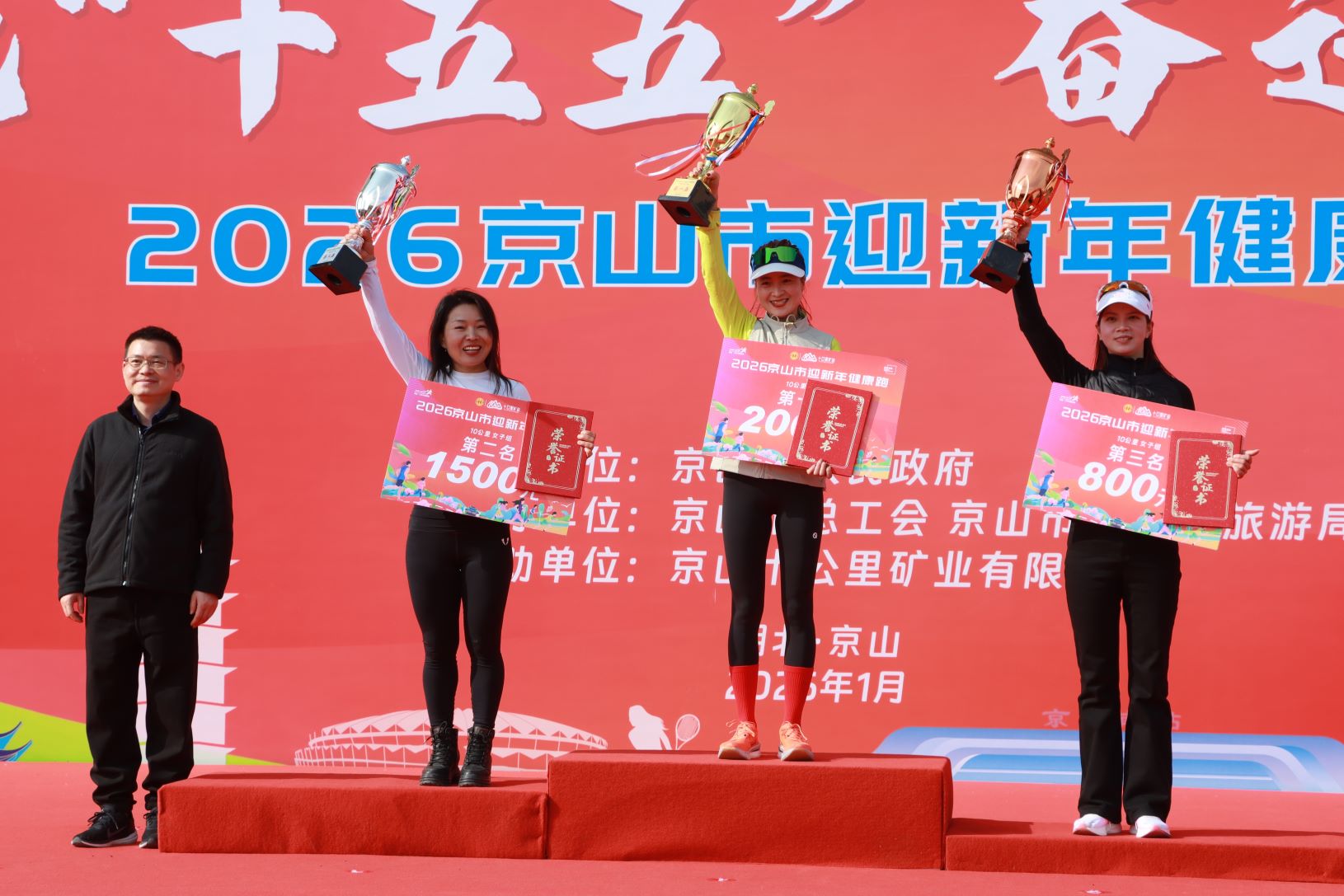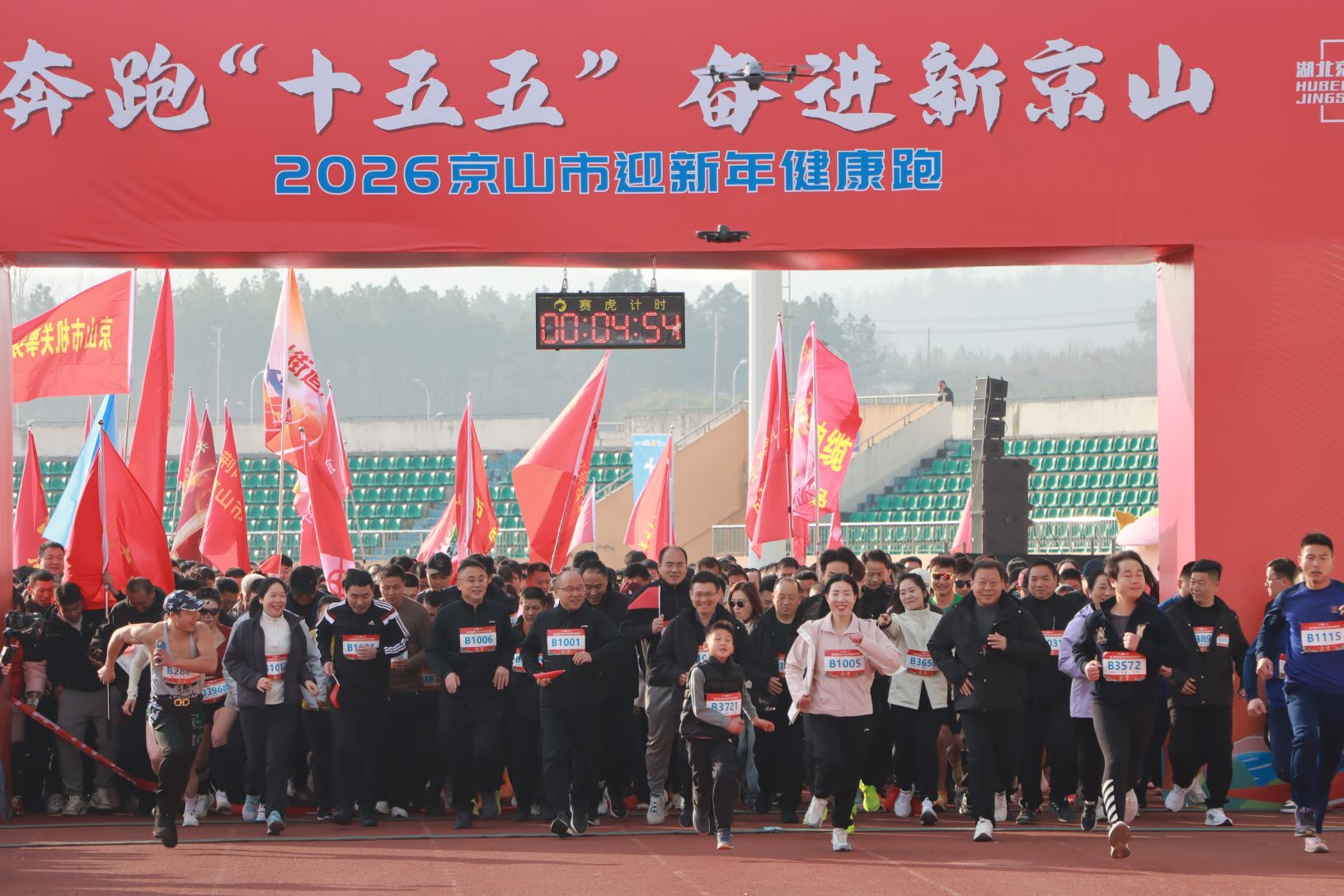 1月10日,2026京山市迎新年健康跑在文体中心体育场鸣枪开跑。市委书记何洪涛出席活动并宣布活动正式开始,市人大常委会主任杨宜云、市政协主席易红梅等市“四大家”领导共同参与。