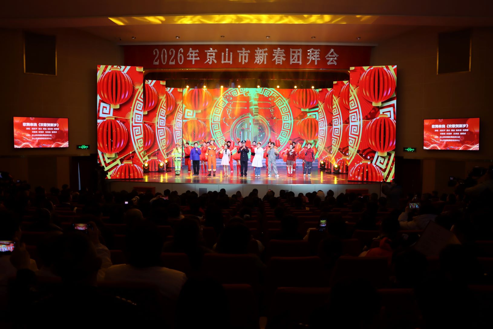 市人民法院院长,市人民检察院检察长,市退休领导干部代表,市直各单位主要负责同志,各镇(区、街道)党政主要负责同志,企业家代表,商会代表,优秀党务工作者、优秀党员代表,劳动模范代表,中国好人、道德模范、荆楚楷模代表,专业技术人才、返乡人员代表,京网合作商家、网旅管家、湖北省网球学校世杰班家长学生代表,以及部分群众和媒体记者代表等一同观看了“马跃新春 福满京山”2026年京山市2026年京山市新春团拜会文艺演出。