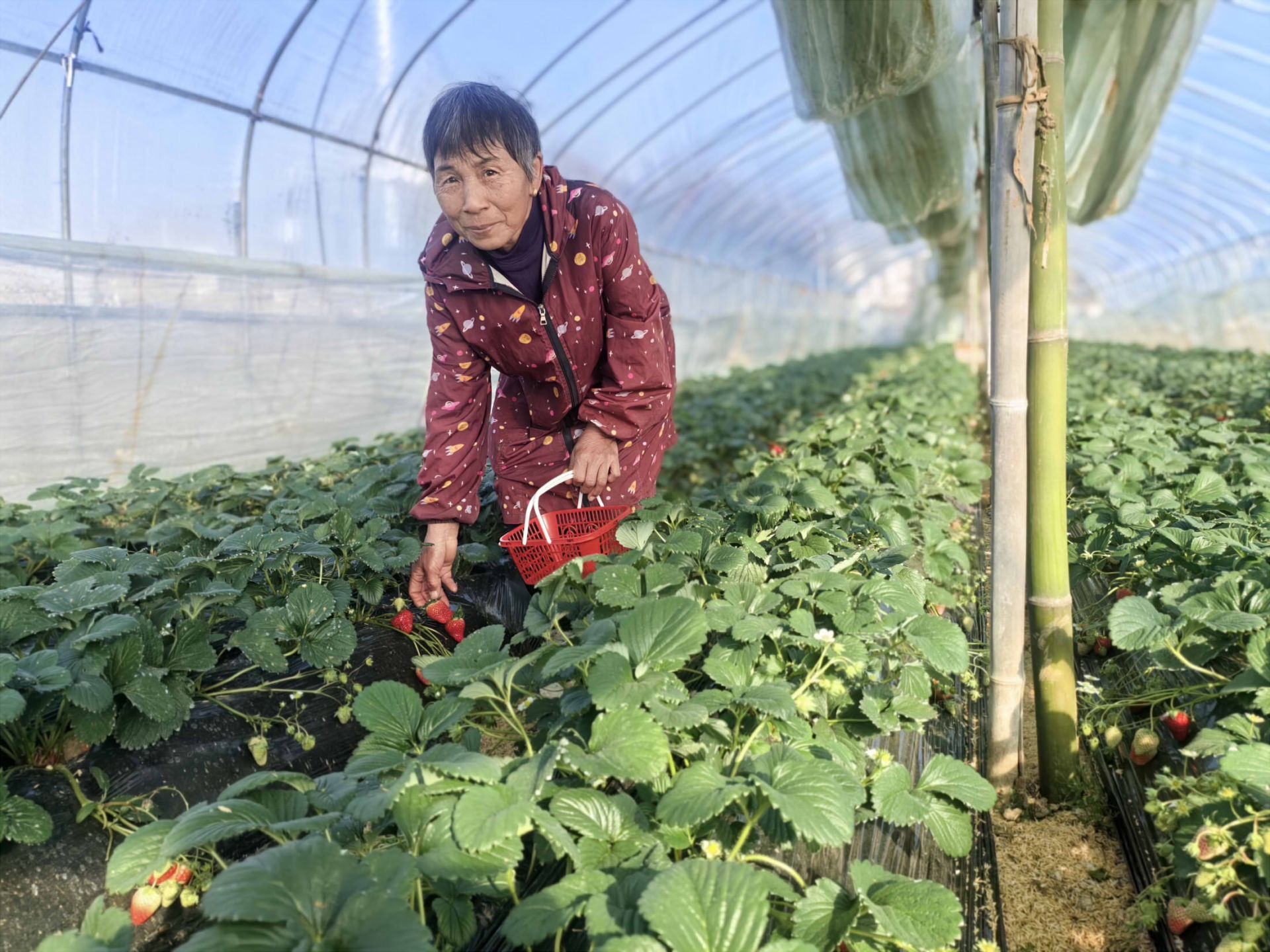为以“小草莓”巧打“农旅产业牌”,该村积极发挥“雁阵”效应赋能“农旅+”互融,探索实践“能人带动+农户承包+土地流转+大棚种植+合作社”的规模化种植模式,借助“农技下乡”培训,因地制宜打造集果蔬种植、采摘销售、休闲观光、生态养殖于一体的草莓种植基地。目前,该基地规模为30余亩,建有草莓大棚10余个,年产量可达1万公斤,带动周边16户村民年均增收2万余元。
